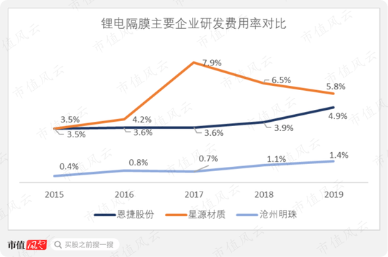 横向来看,公司研发费用率处于中游水平,2019年星源材质为5.8%,沧州明珠为1.4%,恩捷股份介于两者之间,且研发投入全部费用化。