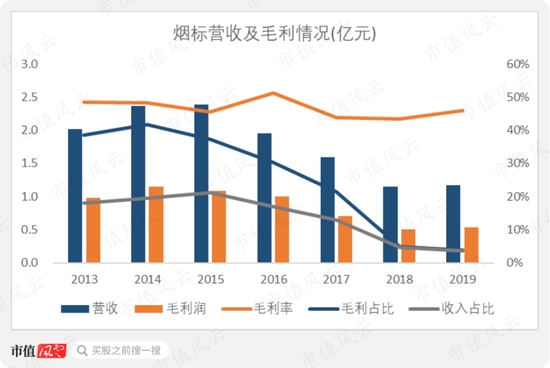 主要原因是公司烟标收入的迅速下滑,从2015年的2.39亿元,降到2017年并购前的1.59亿元,到2019年仅剩1.17亿元。