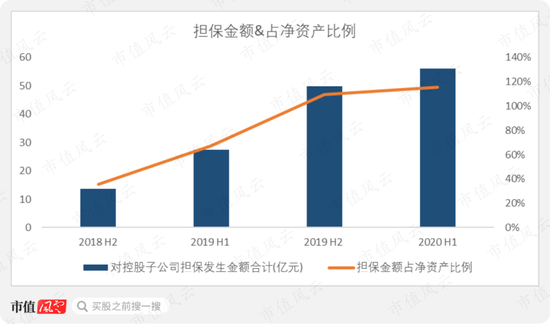 公司担保均为对内担保事项,担保余额上升速度快,截至2020年6月30日,公司对内担保余额达56.1亿元,为净资产的115.8%。
