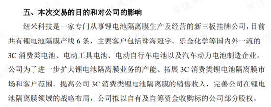 接下来的2020年8月,公司与纽米科技(831742.OC)签订了股权收购意向协议,计划在新三板通过公开竞价收购纽米科技54.76%的股权,此次收购意在扩大湿法隔膜业务在3C和二轮车市场的份额。