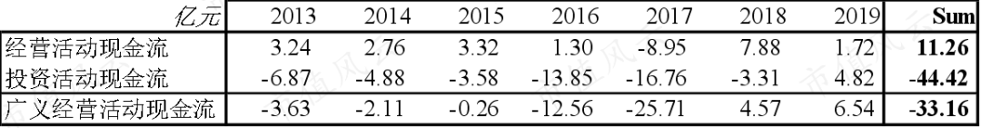 结果不出意外,按照公司的分类,经营活动在过去7年创造了11亿的现金流入,但是同期的投资现金流出高达44亿,导致广义经营活动现金流为-33亿。