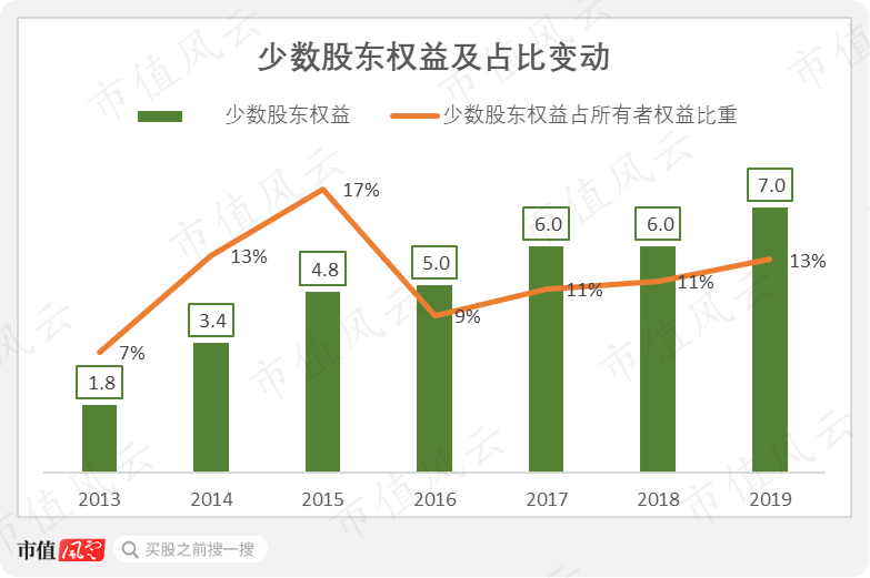 风云君注意到,公司少数股东权益及其占所有者权益的比重近年来也出现了逐渐攀升的态势,从2016年的9%上升到现在的13%,这背后是否也隐含着杠杆安排呢?