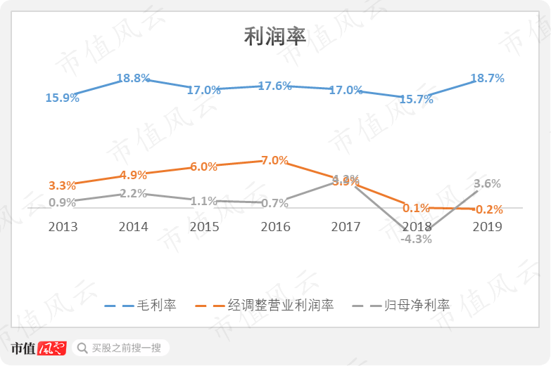 而经调整的营业利润率在近7年间从最高的2016年创出的7.0%降到2019年的-0.2%,最近三年更是严重恶化,而正常的主营业务经营活动近两年压根儿就不赚钱,可谓步履维艰。(注:经调整营业利润是毛利润扣除营业税金及附加、研发、销售、管理费用)