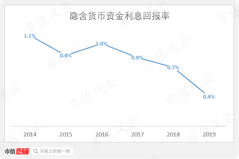 截止2019年末,公司货币资金为10.4亿,但是如果我们计算货币资金背后的隐含利息回报率,则可以看出,躺在银行账户上的现金收益率近年来大幅减少,2019年全年平均仅为0.4%。
