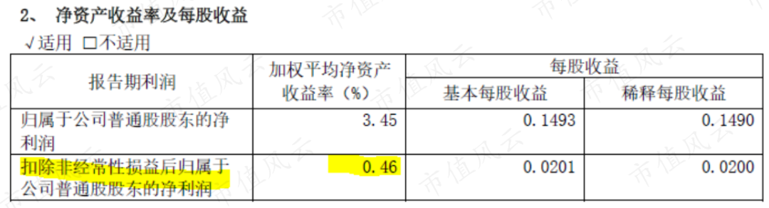 而至于很多投资人关注的公司加权平均净资产收益率(ROE),那也不会有任何意外:扣除非经常性损益以后,2019年的ROE为0.46%。
