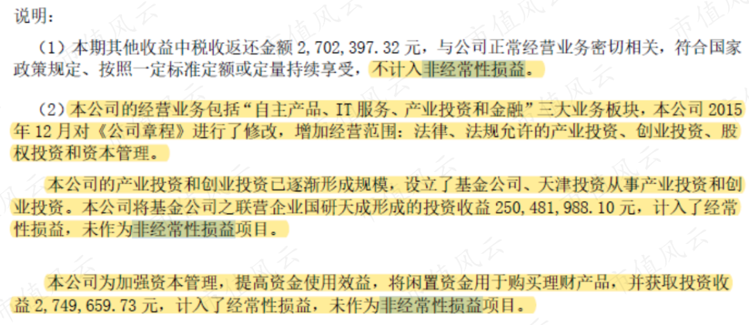 实际上,上面一段披露其实非常关键:如果投资收益都能被当作是经常性的,那潜台词是这家公司已经成为一家金融控股公司了,那风云君干脆建议,把投资收益直接计入主营业务收入,不香吗?