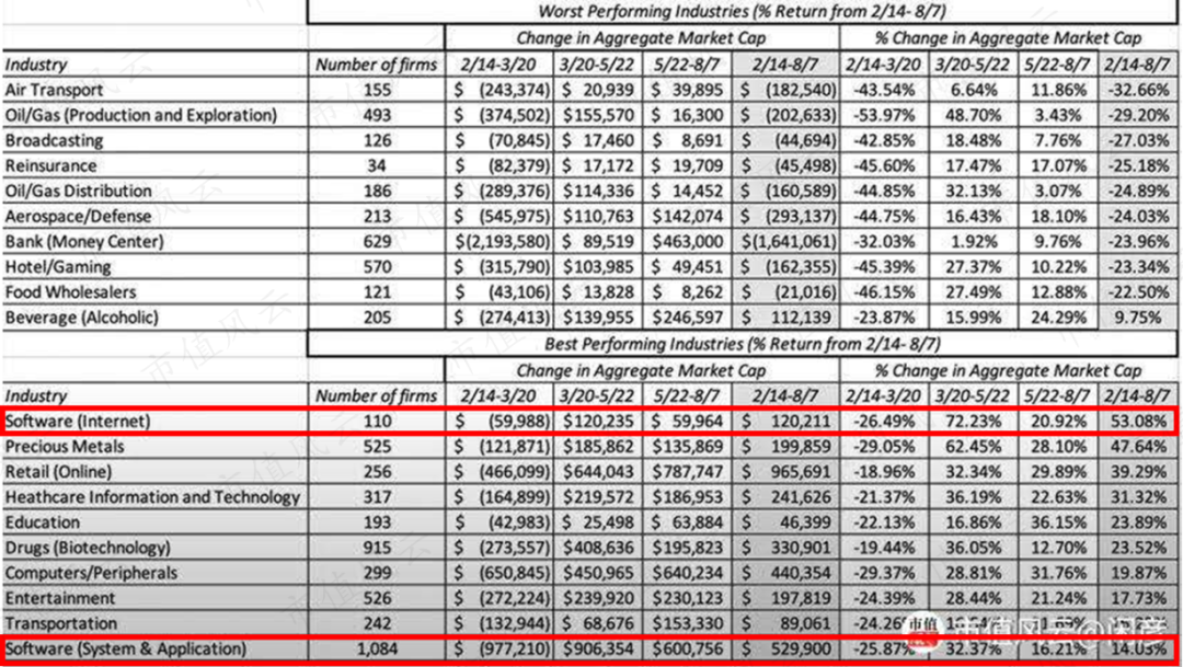 根据“华尔街估值学院院长” Aswath Damodaran教授对全球股票市场的统计,今年2月14日到8月7日中间,互联网软件行业表现牛冠全球,期间涨幅高达53%;而即便是系统和应用软件行业,也取得了同期14%的涨幅,位列榜单第十。