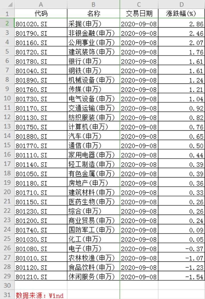 板块方面,申万一级行业分类下(下同)的28个板块,仅4个板块出现下行。其中,采掘大涨2.86%,领涨两市。非银金融、公用事业分别上行2.46%、2.07%,涨幅均超2%。9月8日,仅休闲服务、食品饮料、农林牧渔和电子板块出现下行,分别跌1.54%、1.23%、1.07%和0.37%。个股方面,Wind数据显示,A股8月28日有2611只股票实现上涨,涨停数达61家。而出现下跌的个股有1271只,有18家出现跌停。此外,从个股涨跌幅的主要分布来看,有1590只个股集中在涨幅0%至2%区间,市场弱反弹特征明显。