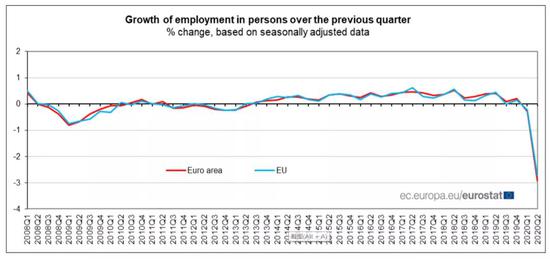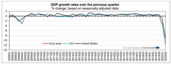 周二,欧盟统计局(Eurostat)公布数据显示,二季度经季调后欧元区国内生产总值(GDP)终值为环比下降11.8%,小幅高于初值预期的12.1%。此外,欧盟GDP环比下降11.4%,两项数据均创自1995年有记录以来的最大降幅。另一方面,欧洲仍面临巨大的就业挑战。欧元区和欧盟第二季度就业人数均创记录最大降幅。