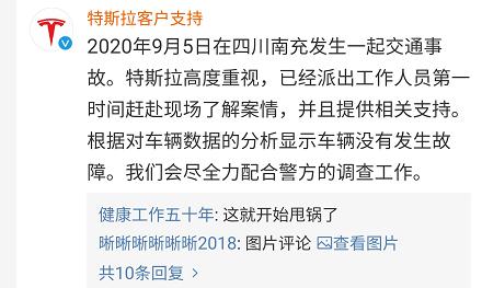 事故发生两个半小时后,特斯拉汽车(北京)有限公司认证的微博名为“特斯拉客户支持”第一时间发布初步声明称,“特斯拉高度重视,已经派出工作人员第一时间赶赴现场了解案情,并且提供相关支持。根据对车辆数据的分析显示车辆没有发生故障。我们会尽全力配合警方的调查工作。”