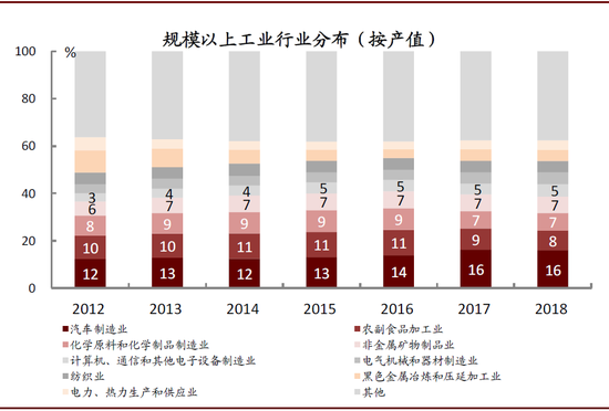 ► 从产业规模来看,新兴产业占比提升。2012-2018年湖北省汽车制造业、计算机\通信和其他电子设备制造业总产值占规模以上工业总产值分别提升4和2个百分点至16%和5%;相应地,同期农副食品加工业、黑色金属冶炼和压延加工业占比分别下降2、4个百分点至8%、5%。