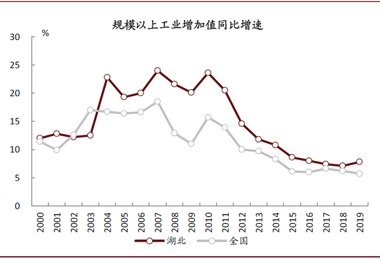 图表:2000-2019年间,湖北省规模以上工业增加值年均复合增速达14%,高于全国3个百分点