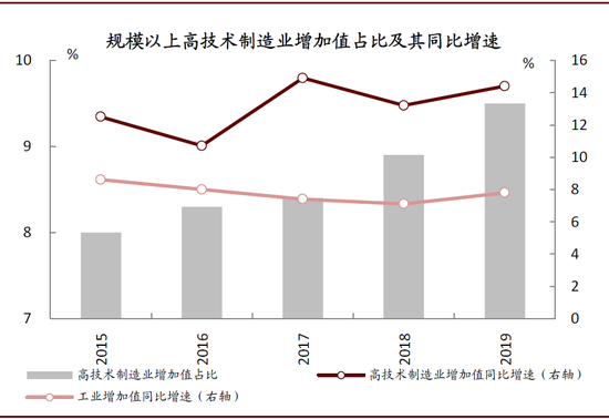 图表:2019年湖北省规模以上高技术制造业增加值占规上工业的比重提升至9.5%(2015年8%)
