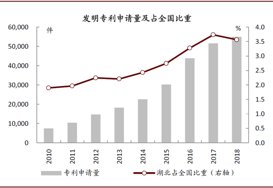 图表: 湖北省发明专利申请量逐年上升,2018年占全国比重达3.6%