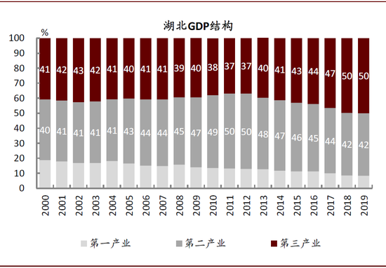 图表:2000-2019年间,湖北省第一、二、三产业占比由19:40:41逐步调整为8:42:50