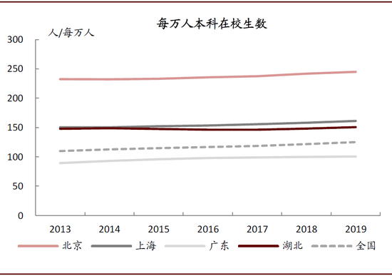 图表:2019年湖北省每万人本科生在校数达151人,接近于上海水平