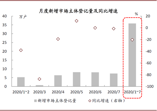 ► 新增市场主体登记量已恢复至去年同期的八成。4-7月湖北省新增登记市场主体30万户,仅略低于去年同期(31万户),1-7月合计新增36万户,同比下降20%(一季度-58%)。