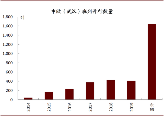 图表:2019年中欧(武汉)国际班列开行408次,较2014年(42次)大幅提升