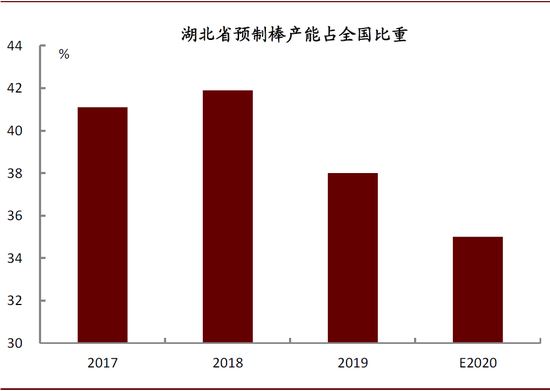 图表:2019年湖北省光纤预制棒产能占全国比重达38%