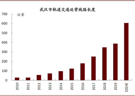 图表:2019年末武汉市轨道交通运营线路长度达388公里,较2010年(29公里)大幅增长