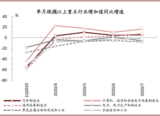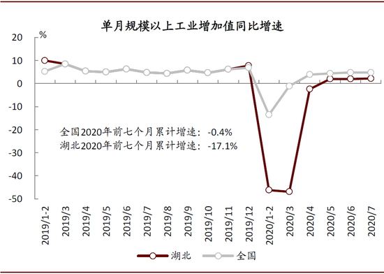 经济强力恢复中。上半年湖北省GDP同比下降19%,降幅较一季度收窄20个百分点。从高频指标上看,7月份规模以上工业增加值同比增长2%,其中计算机\通信、汽车制造业分别同比增长16%和6%。相比之下,“疫”后效应仍在,7月限额以上社会消费品零售额仍同比下滑7%,消费及相关服务业复苏相对缓慢。