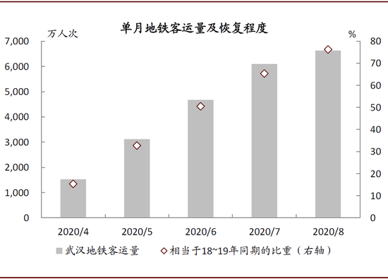 图表: 今年6-8月湖北省武汉地铁出行量分别恢复至过去两年同期的50%、65%和76%