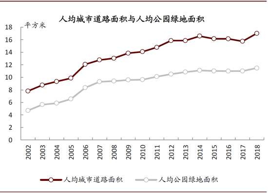 图表:2002-2018年间,湖北省人均城市道路面积与人均公园绿地面积均稳步上升