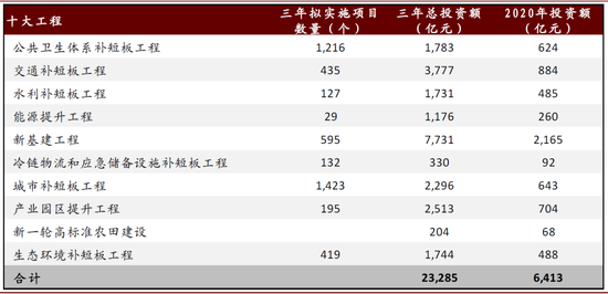► 补短板:疫情在一定程度上暴露出湖北省在公共卫生服务体系等方面可能存在短板,加快补齐短板迫在眉睫。据《省人民政府关于印发湖北省疫后重振补短板强功能“十大工程”三年行动方案(2020—2022年)》,疫后重振经济的十大板块涉及公共卫生、交通、水利、能源和新基建等工程,估算总投资约2.3万亿元,其中2020年约0.64万亿元,相当于2019年全年GDP的14%。