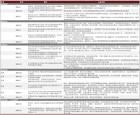 政策助力疫后重振。疫情爆发以来,中央和地方政府支持湖北重振的政策措施不断推出,我们预计减税降费、稳岗就业、金融援企等政策有望支持湖北加速“重启”。