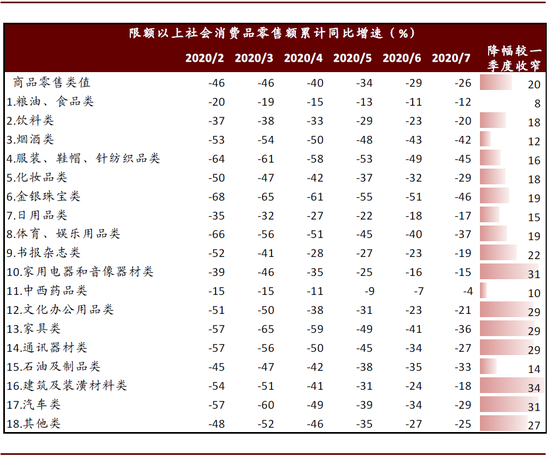 • 从类型来看,生活必需品受疫情冲击较小,且耐用消费品恢复更快。1-7月限额以上粮油食品、中西药品等生活必需品零售额同比下滑幅度相对较小,而服装鞋帽、金银珠宝累计下降逾40%。特别地,汽车、建筑装潢材料、家具等耐用消费品疫情期间跌幅较大,但4月起跌幅逐月收窄,1-7月累计跌幅较一季度收窄约30个百分点。