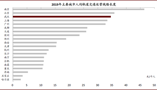 图表:2019年武汉市人均轨道交通运营长度达35米/千人,位列全国主要城市第3,中部城市第1