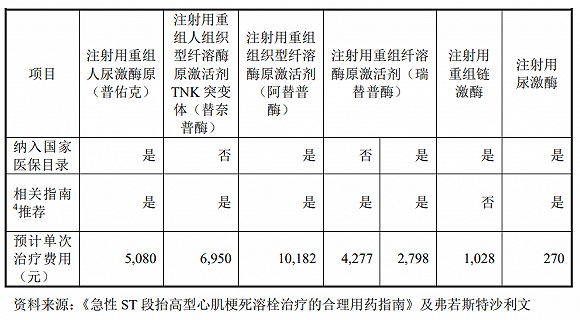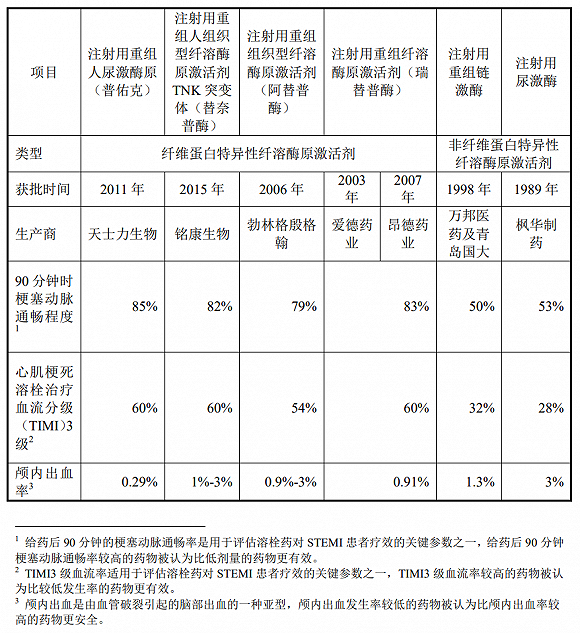 天士生物描述,勃林格殷格翰公司产品注射用阿替普酶(商品名:爱通立)凭借其适应症更多的优势,在溶栓药大市场仍拥有更高占有率,而普佑克仅有急性ST段抬高型心肌梗死适应症获批,与阿替普酶及尿激酶相比,普佑克的适应症范围较为单一。不过天士生物对自己产品还是蛮有信心,其称,有别于中国最常用的溶栓药阿替普酶,普佑克不会与血浆中的蛋白酶抑制剂形成共价复合物,因此,普佑克及蛋白酶抑制剂在血液中的浓度不会降低。这种抑制剂的存在与预防系统性出血直接相关,更高的抑制剂浓度有利于降低患者颅内出血率。