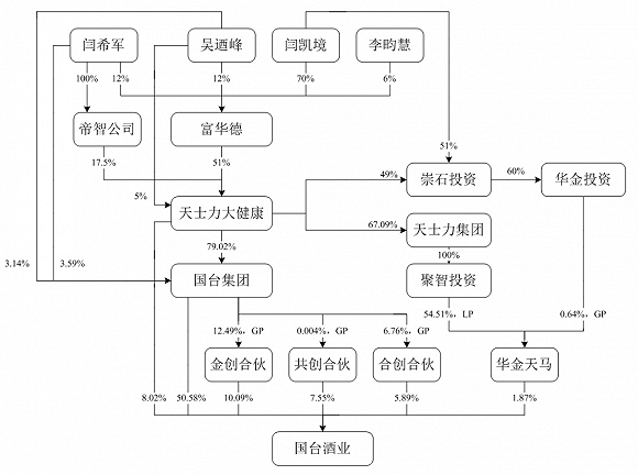 5月22日,证监会网站披露了国台酒业的招股说明书。当中显示,国台酒业成立于2001年3月22日,也有20年的历史了,注册资本3.65亿元,专注于酱香型白酒的研产销,其三个酿酒基地均位于仁怀市茅台镇,是茅台镇第二大酿酒企业。这贴着茅台镇第二家酱香酒上市公司标签的背后,正是闫氏家族。闫希军、吴迺峰、闫凯境和李畇慧正是国台酒业的实际控制人,4人通过国台集团、天士力大健康及华金天马合计控制国台酒业84%的股权。
