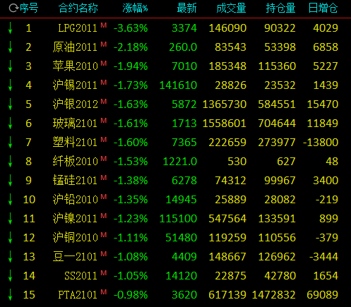 热点栏目9月11日,国内期市早盘多品种下跌,农产品飘红,淀粉、玉米、豆粕涨逾1%,苹果跌近2%;能化品延续弱势,LPG跌逾3%,原油跌逾2%,玻璃、塑料跌近2%;有色走跌,沪锡、沪铅、沪镍、沪铜跌逾1%。