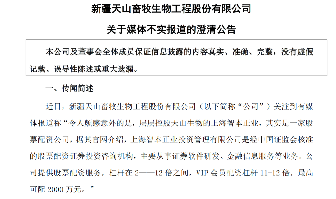 就媒体报道控股股东天山牧业的控股股东智本正业涉及场外配资一事,天山生物9月11日中午火速发布澄清公告,称智本正业一直从事农业投资管理,从未从事过股票配资业务。上述传闻均为不实传闻。经上海智本正业核实确认,其网站域名已于2020年3月21日到期,到期后已无官网。根据域名信息查询结果,该域名已被注册人dropcatch.com重新注册,并沿用原ICP备案信息,假冒上海智本正业名义,进行非法活动。