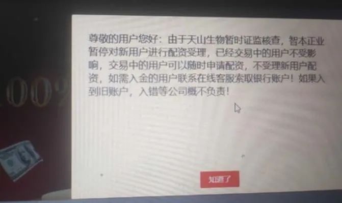 此外,根据9月11日中午网传图片,智本正业今天对用户发布通知称,由于天山生物暂时证监核查,智本正业暂停对新用户进行配资受理,不过已经交易中用户不受影响。