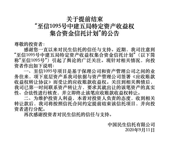 9月11日,民生信托针对至信1095号的相关情况做出了回应。