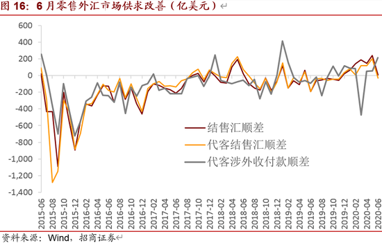 7月我国外汇市场供求形势边际改善,代表零售外汇市场的银行结售汇实现逆差-177亿元,较6月份恶化238亿元,恶化主要来自于银行代客结售汇,银行自身结售汇有所改善。