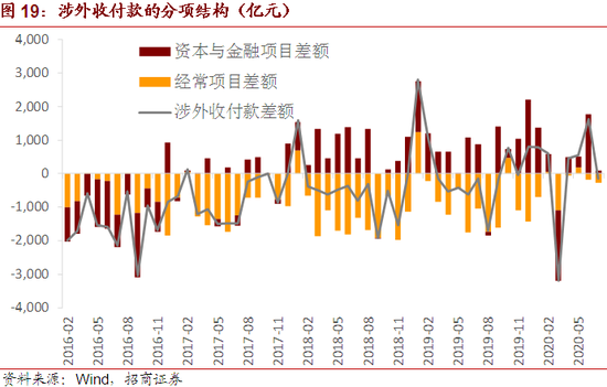 7月银行代客涉外收付款实现逆差-20亿元,较上月水平有所恶化,边际下降249亿元,涉外外汇收支差额、人民币收支差额均有所恶化。人民币收支方面,从经常项目的情况来看,7月由上月的-179亿元逆差恶化至逆差-276亿元;资本与金融项目差额规模边际下降1673亿元至顺差90亿元。