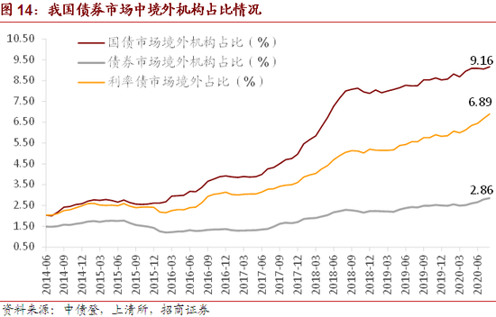 8月境外机构在我国国债市场中的占比持平于9.16%(7月为9.06%),利率债市场占比为6.89%(7月为6.69%)债券市场整体的境外占比为2.86%(7月为2.79%),均较上月有所上升。