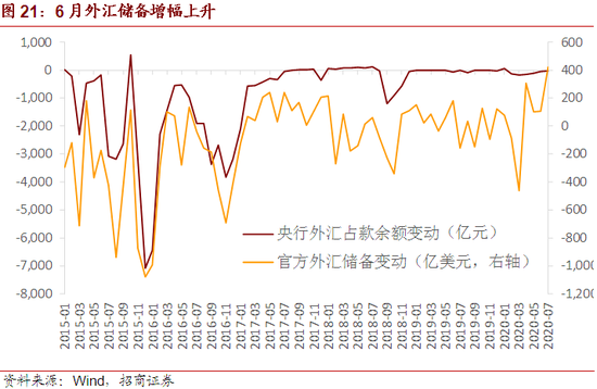 7月央行外汇占款余额变动为-19.3亿元,央行对于汇率或有小幅干预,人民币贬值压力上升,特别是较为接近7.2的关键位置,加大了央行干预的必要性。6月末央行官方外汇储备余额为3.15万亿美元,环比上升420亿美元,6月美元指数小幅走弱,从而带来外汇估值效应的正向影响为109亿美元,大体与外汇储备的上升规模一致。