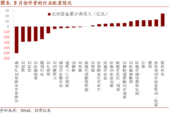 从外资的行业配置情况来看,8月份外资主要增持了资本货物、医药生物、运输、银行等行业,减持了半导体、保险、材料、电信服务、多元金融等行业。