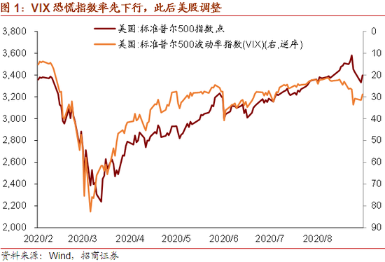 值得注意的是,VIX恐慌指数更早出现抬升,与美股走势分化。自8月18日以来,VIX指数即开始出现抬升,而在这期间美股仍然处于上涨趋势之中。通常而言,VIX指数与美股股指表现反向,原因在于VIX指数是指数期权隐含波动率加权平均后所得的指数,美股下跌通常使得隐含波动率出现上升,因为美股下跌,风险对冲的需求将上升。但是指数下跌也并不是隐含波动率上升的唯一影响因素。最近美股的一个热门话题就是散户的大量入场及其影响。在今年流动性宽松、实体经济受冲击、居民获得现金补助的情况下,资金“脱实向虚”,散户大量涌入美股市场。近期散户不断因个股因素而买入部分龙头科技股及其看涨期权,从而推动了市场的上涨和期权价格的上涨,并使倒推出的隐含波动率出现上升。这既解释了VIX与美股表现的分化,也解释了前期没有明确宏观因素支撑下美股指数的上涨。