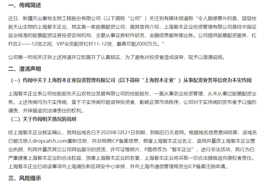 天山生物火线辟谣:智本正业网站被配资公司盗用
