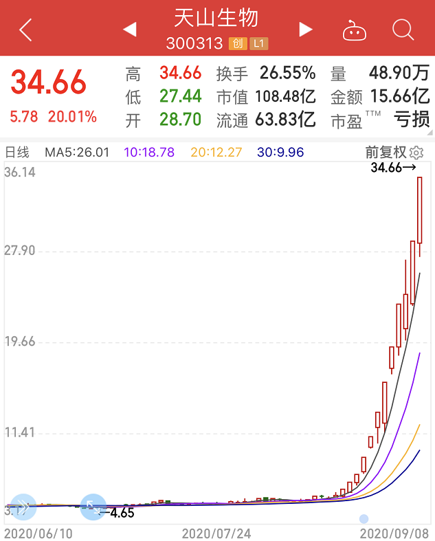 数据显示,天山生物自8月19日开启妖股行情,12个交易日内,仅9月4日未涨停,其余全部实现涨停,其中包括8个20%涨停,即12天暴涨超5倍。