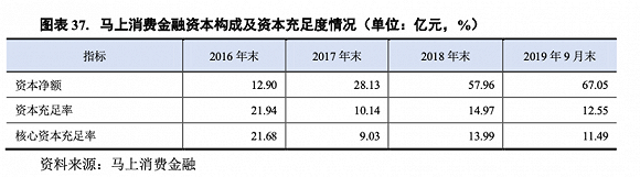 马上消费金融高速扩张的背后,资本不足、杠杆率超标等成为制约公司发展的核心问题。根据马上消费金融披露的数据,2016年至2019年9月,马上消金的核心资本充足率分别为21.68%、9.03%、13.99%、11.49%,核心资本充足率游走在监管红线边缘。