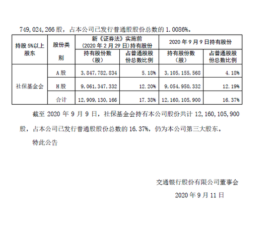 9月11日消息,交通银行公告:社保基金会已累计减持1%公司股份,完成本次减持;目前社保基金会持有公司16.37%股份,仍为第三大股东。