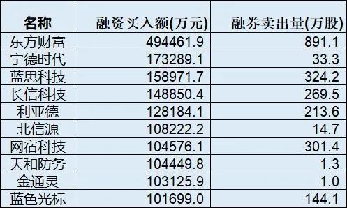从融资客重点加仓的创业板个股来看,本周前4个交易日(9月1日-9月10日),融资客对创业板买入额前十的个股分别为东方财富、宁德时代、蓝思科技、长信科技、利亚德、北信源、网宿科技、天和防务、金通灵、蓝色光标,这些个股均被买入超10亿元。