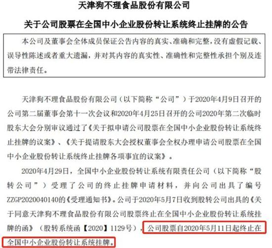 今年5月11日,老字号天津狗不理食品股份有限公司正式从新三板市场摘牌退市。实际上,早在5月8日狗不理就对外发布公告,狗不理公司主动申请从新三板市场摘牌退市。