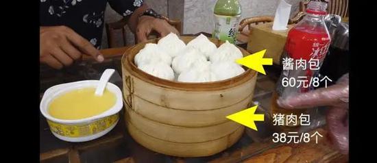 视频中,@谷岳 称该店在大众点评网上的评分是2.85分,在王府井地区的餐厅中评分最低。博主走进餐厅,花60元买了一笼8个的酱肉包,又花38元买了一笼8个的猪肉包。最后,@谷岳总结说,酱肉包特别腻、没有用真材实料;而猪肉包则是皮厚馅少,面皮粘牙。